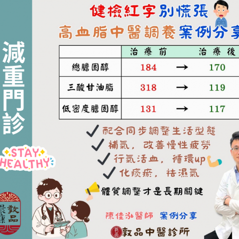 敦品中醫 陳佳泓 醫師 降血脂案例 這位35歲 C 先生,工作壓力大、長期外食,炸物、辣食、含糖飲料幾乎天天來,健檢時發現——三酸甘油酯過高,低密度膽固醇偏高。 治療前檢驗數值(mg/dL) ▪️ 三酸甘油酯 ...