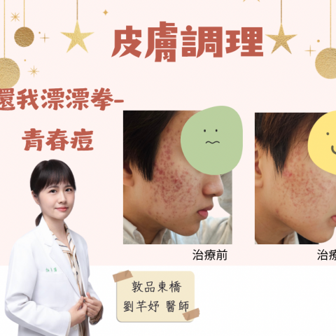 敦品東橋中醫 劉芊妤醫師 皮膚病案例 中醫治療青春痘 18歲的王同學,最近反覆爆痘,讓愛漂亮的青少年心情低落,影響自信心。劉醫師診斷後發現他的脈象滑數、飲食不忌,喜歡甜食,屬於脾胃濕熱類型,在使用中藥清除...