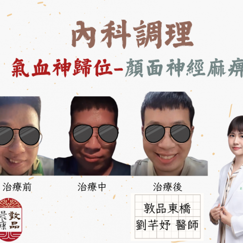 敦品東橋 劉芊妤醫師 顏面神經麻痹案例 26歲的小龍前來門診,主訴突然右邊的臉不能動了,味覺也消失。劉醫師望診病人的面部,右嘴角無法上揚,右眼無法和左眼同步閉上,病人的法令紋及臥蠶也不見了,這正是「顏面神經...