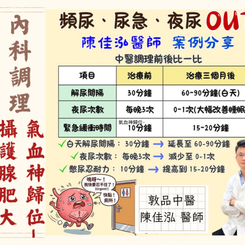 敦品中醫 陳佳泓醫師 攝護腺肥大 案例 「陳醫師,我現在出門都要先找廁所,不到半小時就想尿,這日子怎麼過?」 56歲的W先生,這兩年飽受「攝護腺肥大」之苦。無論春夏秋冬,每30分鐘就得跑一次廁所;晚上睡覺也要起來...