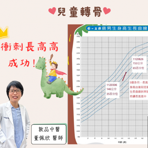 敦品中醫 董佩欣醫師 兒童轉骨案例分享 12歲的小弟,來診時身高比起同學矮了一截,平時胃口不好,吃不多又挑食,早上起來鼻子過敏, 打噴嚏流鼻水,偶爾還擤鼻子到流鼻血,晚上因為鼻塞睡不好, 黑眼圈明顯,上課時總...